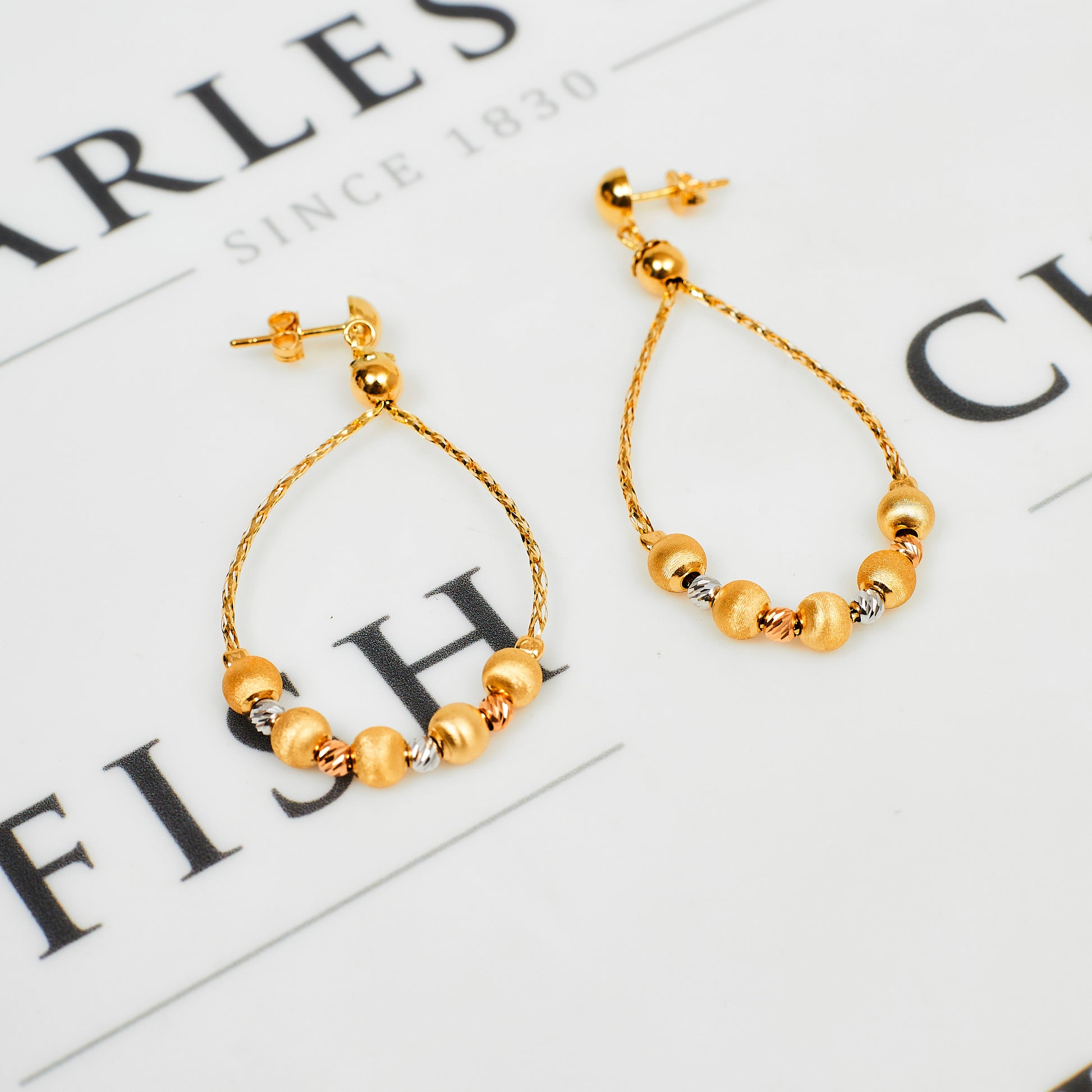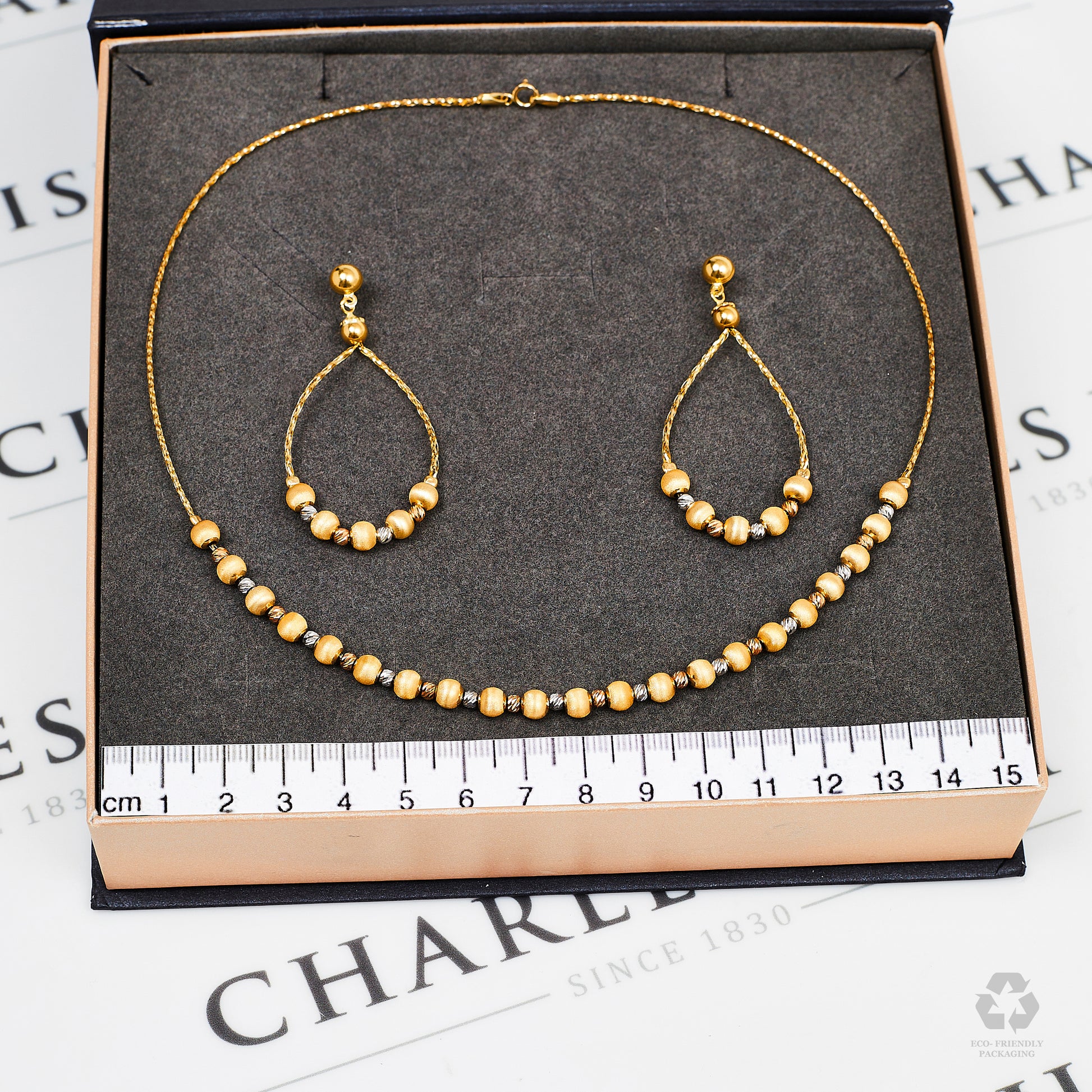 One for those who love a coordinated look to their accessories here! This jewellery set features a bead design necklace and matching drop earrings with plenty of texture and added flair thanks to their tricolor 18ct gold design. This set is a pre-owned, stylishly sustainable and unique listing: if you love it, make it yours before it's gone for good. DETAILS: The elegant necklace is 16" long and has a spring ring clasp for secure closure. The earrings measure approx. 43mm x 24mm and have scroll/butterfly backs so you know they’ll stay in place wherever you’re headed. The set weighs 9 grams in total. We take great care to ensure our pre-owned jewellery pieces are carefully polished to the highest standard so they look as good as new. This second-hand item comes fully hallmarked, with a certificate of authenticity and eco-friendly packaging, ensuring customers can be confident in the value of their new purchase.